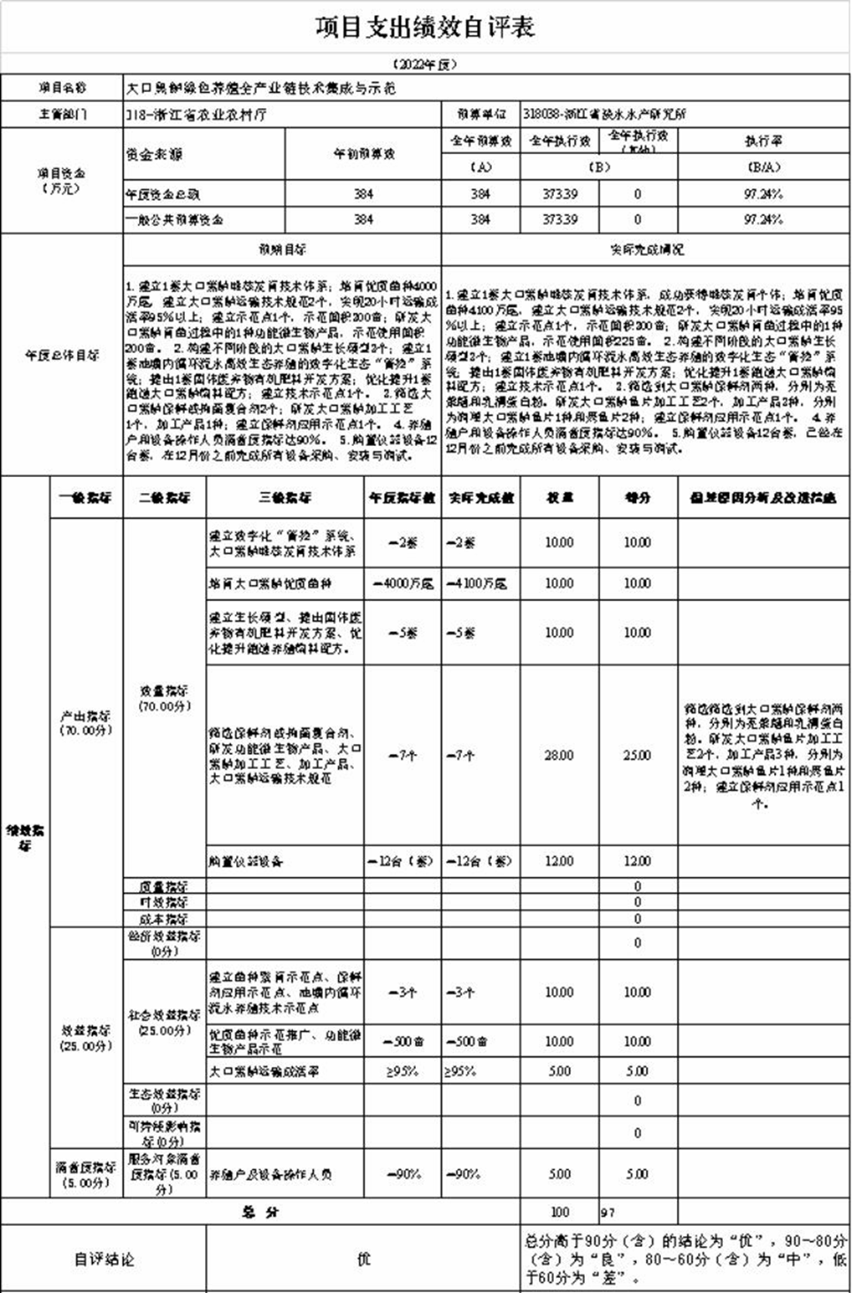 浙江省淡水水产研究所随决算公开 2022 年度本单位项目支出绩效自评结果(详见附件)。其中,“大口黑鲈绿色养殖全产业链技术集成与示范”项目和“淡水虾类智能化育苗车间及 SPF 育苗体系构建”项目绩效自评具体情况如下: