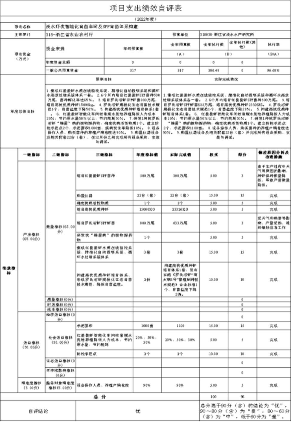 “淡水虾类智能化育苗车间及 SPF 育苗体系构建”项目绩效自评综述:根据年初设定的绩效目标,基本完成。项目自评得分96 分,自评结论为“优”。项目全年预算数为 317 万元,执行数为 314.10 万元,完成预算的 99.08%。项目绩效目标具体情况: 一是集成红螯螯虾水质在线监控系统、精准化自动投喂系统和循环水高效处理系统各一套;二是培育红螯螯虾 SPF 苗种 300 万尾;三是红螯螯虾智能化车间较常规水泥池养殖降低人力成本20%,节约用水量 50%以上,节约能耗 30%;四是培育罗氏沼虾 SPF 虾苗 633 万尾,培育高抗优质种虾 23326KG;五是罗氏沼虾规模化生态育苗技术规范 1 个,育苗盐度下降 28%;六是构建高抗优质种虾培育体系 1 套;七是研发 1 种抗罗氏沼虾“滴星”病的植物源药物,确定抗病活性物质 1 个,建立防控示范点 2个,示范面积 1100 亩;八是设备操作人员、购买苗种的养殖户满意度达 90%;九是购置仪器设备及相关配套 22 台(套)并完成所有设备采购、安装与调试。发现的问题及原因:由于生产过 程中受连续高温天气的影响,种虾规格、质量降低,导致产苗数 量降低。下一步改进措施:一是做好保育种水源工作。二是确保育种适宜温度。三是做好应急预案,提高种虾质量。