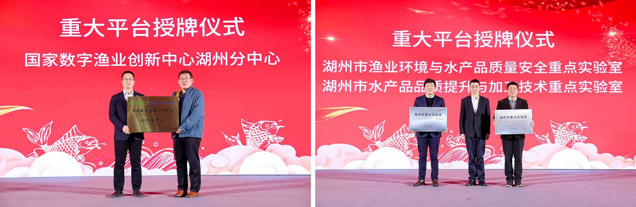 ▲科技兴渔共富示范基地(上),国家虾蟹产业技术湖州综合试验站示范县、示范基地(左下),罗氏沼虾“南太湖3号”苗种扩繁基地(右下)授牌仪式现场